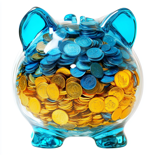 a crystal blue piggy bank, a lot of money falling out, money around piggy bank, too much money fall off of piggy bank