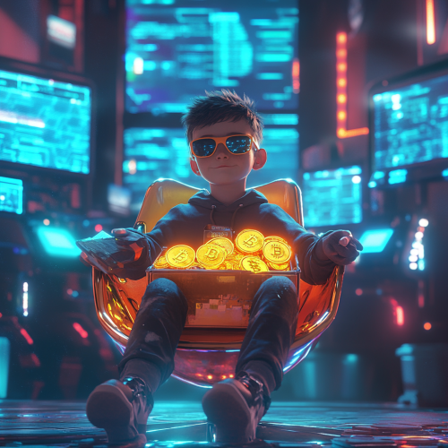 Create a futuristic scene featuring a cool young boy wearing sunglasses, seated on a unique, colorful chair in a high-tech room. Behind him, multiple glowing screens display futuristic data and graphics. The boy is holding an open briefcase filled with glowing Bitcoin coins, overflowing with vibrant light. The atmosphere is sleek, colorful, and tech-driven, with the room’s neon lights and modern design adding a dynamic, energetic vibe. The overall composition should feel playful, yet advanced, capturing the essence of a futuristic tech prodigy in the world of cryptocurrency.