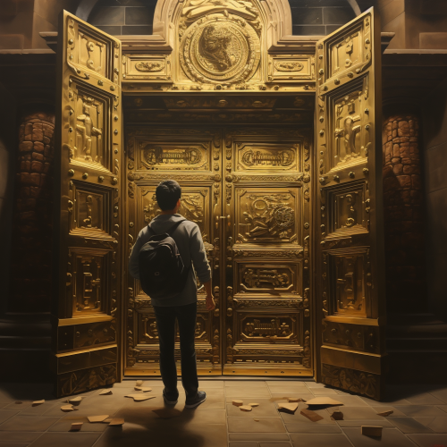 puertas que se abren hacia la bundancia, con mucho dinero y oro hiper realista