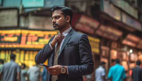 off-broadway, A modern Indian stock trader, wearing formals, worried and confused, making sell orders on the stock exchange, standing outside of Bombay Stock Exchange, image shot on Canon EOS R8, --style raw --v 5.1 --ar 7:4