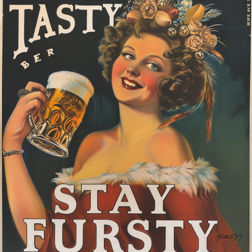 1930s advert for beer, with the text "TASTY TASTY BEER" in the advert and separate text "STAY FURSTY" at the bottom of the advert --v 6.0 --s 50 --style raw