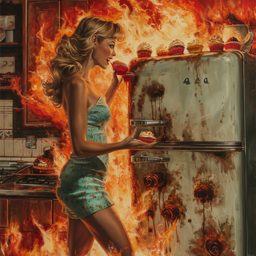 an agressive refrigerator force feeds a woman cupcakes in a fiery kitchen --s 250 --v 6.0