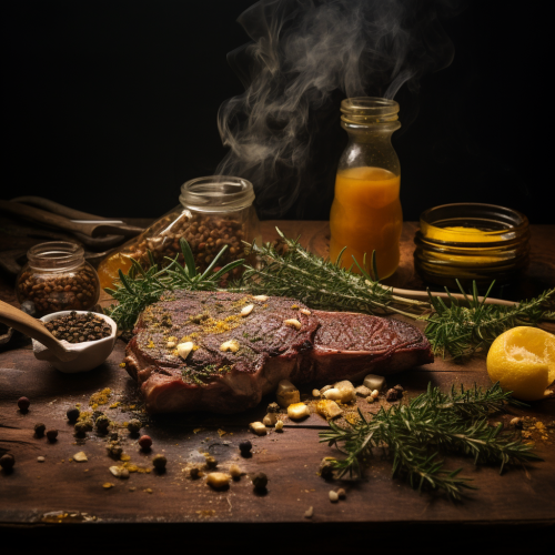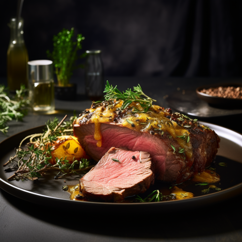 fotografía en 8k de un solomillo de buey asado con hierbas de mostaza al estilo de Beth Galton