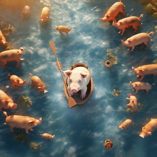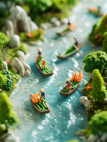 Bird's Eye View, the cover of a food advertisement, shows some pieces of pork forming a river, ultra-realistic pork, a man boating in the river, red and light blue, natural light, advertising design poster, movie poster, macro scene, big atmosphere, rendered in cinema4d, texture-based, realistic details, movie lighting, 8k