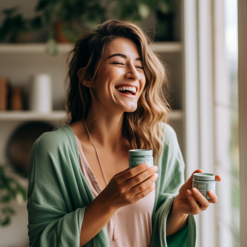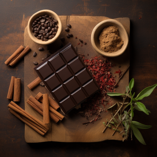 center chocolate bar with 6 squares on a table, peruvian maca, ASHWAGANDA, and fenugreek displayed next to it, top view