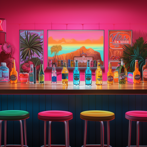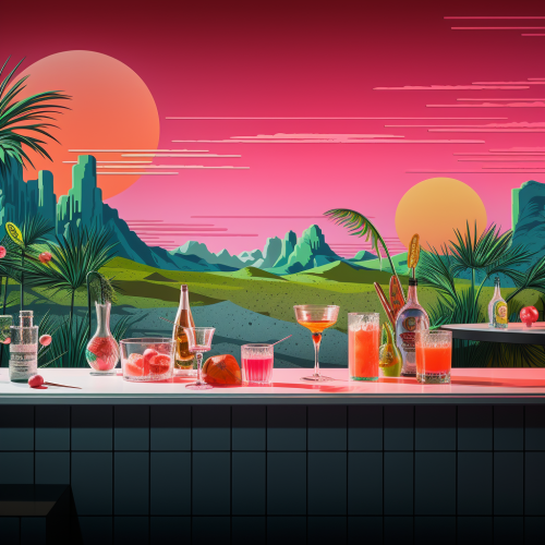 a photo realistic product image featuring cocktails and beer bottles on a bar top in the foregorund with a wall in the background. make the wall have a 1980s paintede mural with an over all hue of neon pink.