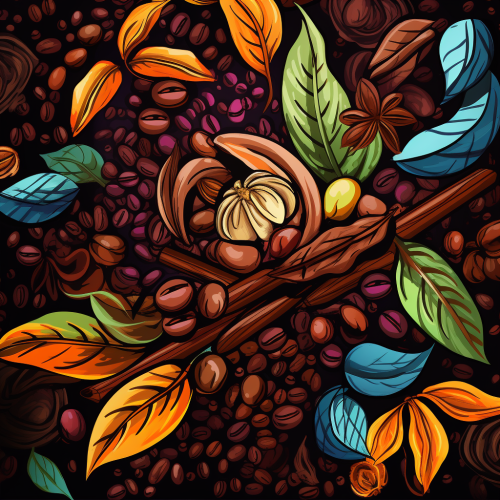 colorfull tasty illustration with coffee beans and spices, bright, indian pattern style