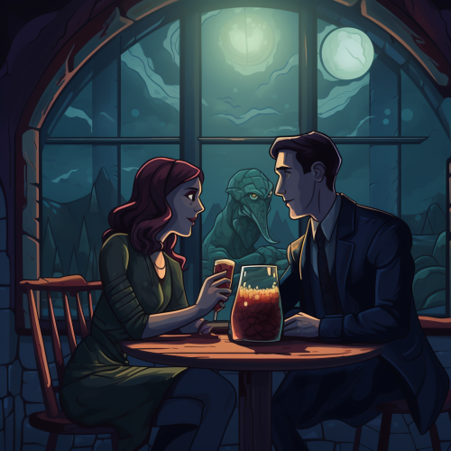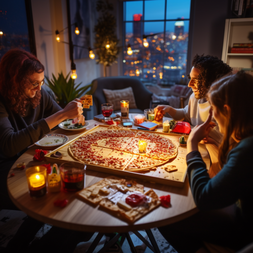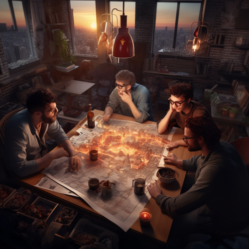 3d rendering. Friends playing dungeons and dragons with pen and paper on tabletop at 7pm inside small 10th floor cozy warm apartment overlooking the busy new York city. delicious gooey hot pizza and beer bottles. everyone is having Good time
