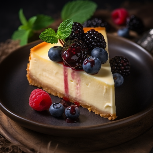 : Creamy Cheesecake Fantasy, Soft Creams and Rich Browns, Soft Evening Light, Overhead Shot of Cheesecake Slice, Fresh Berries –ar 4:5