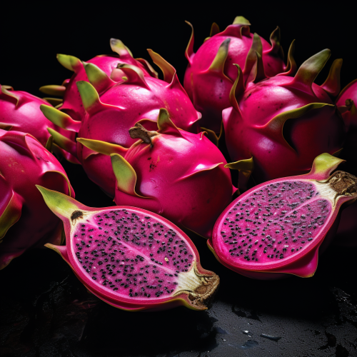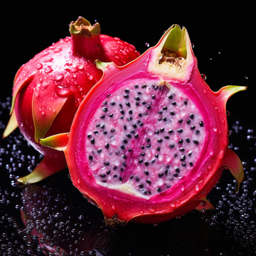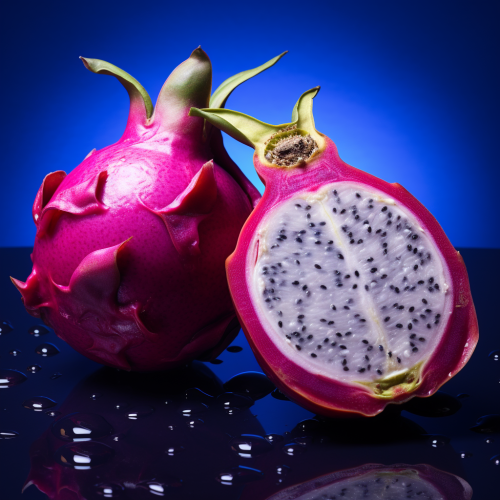 hyper realistic photo of dragon fruit, cut in half to show inside texture, positioned next to Acai berries. Beautiful colors, fresh looking, bright. On a white background