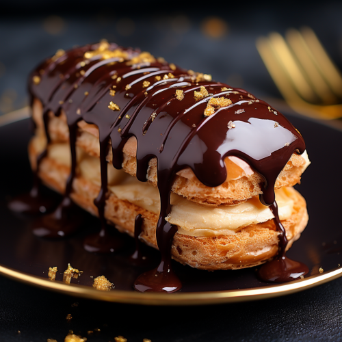 : Elegant Éclair Affair, Deep Browns and Creamy Tones, Festive Evening Glow, Close-Up of Éclair with Chocolate Drizzle, Gold Leaf –ar 4:5