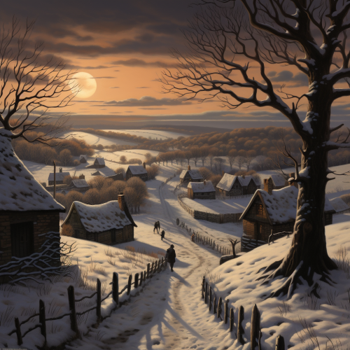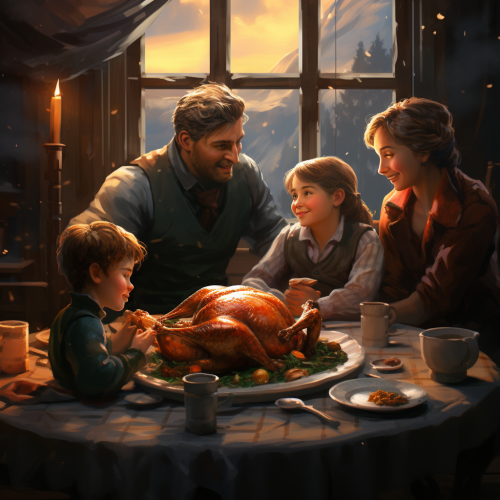 a family sitting around a table in hiking snowiy day and on the table put A delicious dish of roast chicken, split lighting, concept art, also put all the focus on the delicious dish of roast chicken