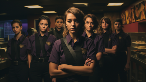 a Polaroid style photograph of an all female Taco Bell staff at night with a scared look on their face --ar 16:9