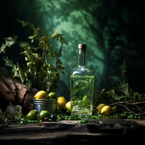 a background with fir trees, mirabelle plums and elderflower, a green bottle of alcohol in the middle of the composition, dramatic feeling, cinema lighting