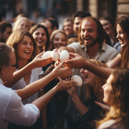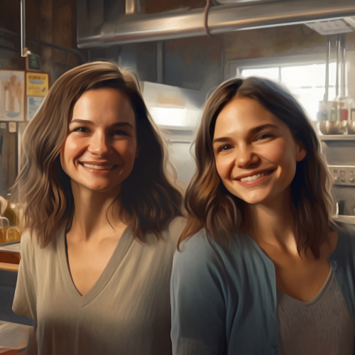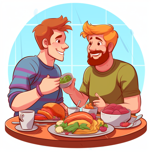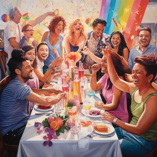 a vibrant and inclusive artwork capturing the essence of a gay brunch. Picture a cheerful scene with a diverse group of people gathered around a brunch table adorned with rainbow-colored tablecloths and decorations. The brunch attendees are portrayed with different expressions, showcasing joy, laughter, and a sense of community.