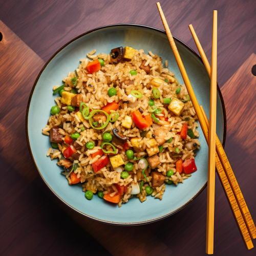 top down photography of a bowl of fried rice on top of a square bamboo placemat, light blue background --ar 1:1
