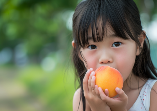 A girl eating a peach.Japanese tween model girl.Full color photo.The resolution should be 30.4 megapixels, ISO sensitivity: 100, Shutter speed 1/2000 second. The image should be hyper-realistic, highly detailed, and high-resolution 16k.photogenic, --style raw --v 6.0 --ar 7:5