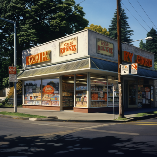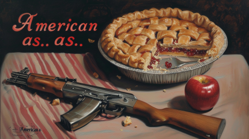a magazine advertisement from the 50s of an apple pie, an AR15 and the words "American as..." painted by Edward Hopper --ar 16:9 --v 6.0