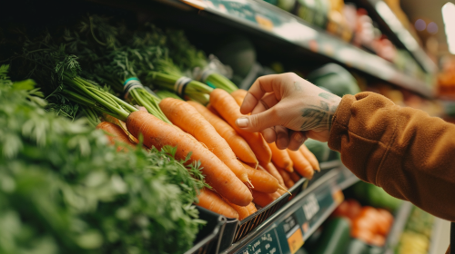 grocery store worker reaching carrot out putting it on carrot shelf, tight shot, no face, in a grocery store --ar 16:9 --v 6.0 --style raw