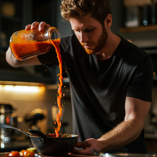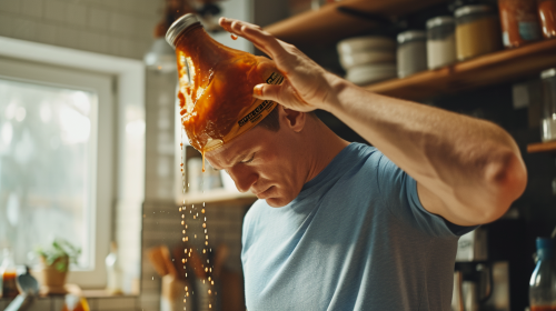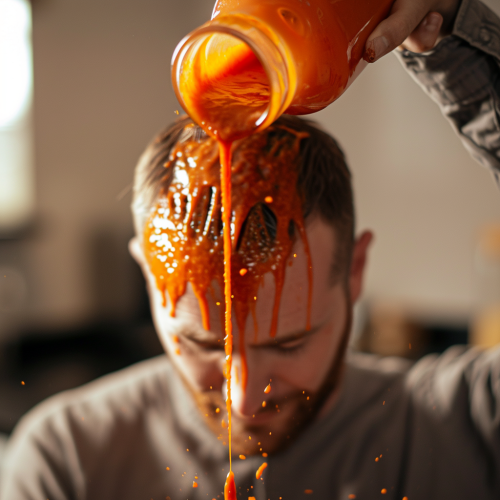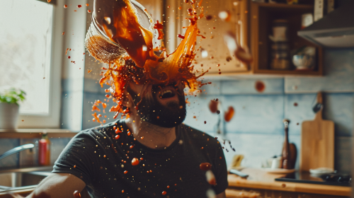hot sauce being poured on eli manning's head in kitchen --v 6.0 --ar 16:9