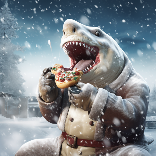 a photo realistic illustration of a Land Shark, drinking a jub of milk, eating slices of bread, snowing, snow, snow man, white background