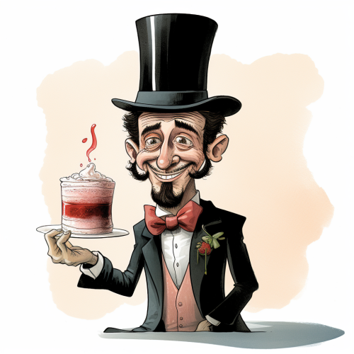 a new york times style cartoon of a man with a top hat, holding a trifle
