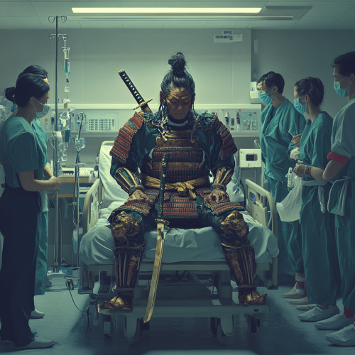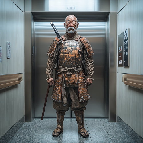 A hyper-realistic and emotionally evocative image of a 120-year-old samurai, freshly awakened from a long coma, wandering near a modern hospital elevator. The samurai, dressed in ancient, weathered armor with a katana at his side, looks confused and disoriented. He stands in front of the elevator doors, which are sleek and metallic, contrasting sharply with his historical appearance. The corridor around him is bright and sterile, with modern signs and medical staff passing by, some glancing at him with surprise. The scene captures the samurai's bewilderment as he tries to make sense of his surroundings, evoking a deep sense of displacement and timelessness.
