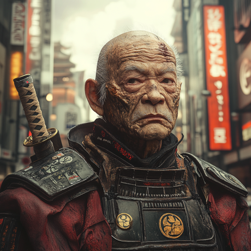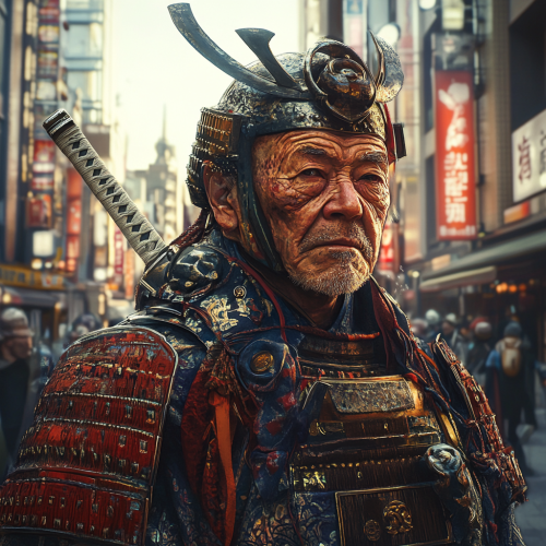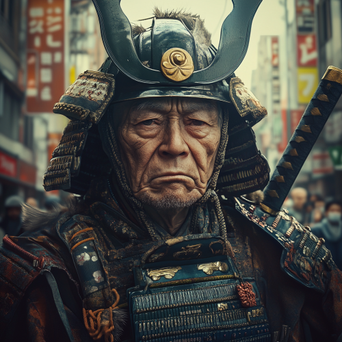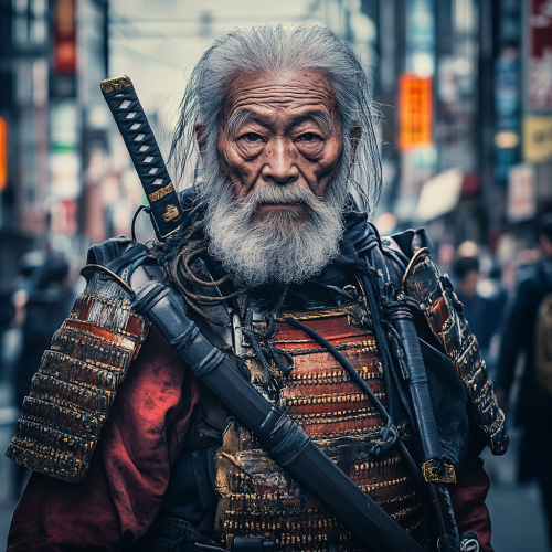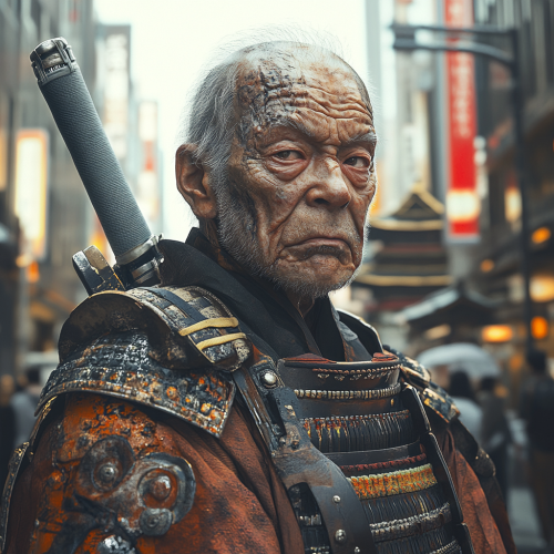 A hyper-realistic, aesthetic depiction of a 120-year-old samurai who has just awakened from a long coma, wandering through the modern streets of Japan. The samurai wears intricately detailed, weathered armor with a katana at his side. His face shows deep lines of age, and his eyes reflect a mixture of confusion, sadness, and awe as he takes in the bustling city around him. The environment contrasts modern elements like skyscrapers, neon signs, and cars with traditional aspects such as a distant Japanese temple. The overall atmosphere should evoke strong emotions, highlighting the samurai's displacement and the passage of time.