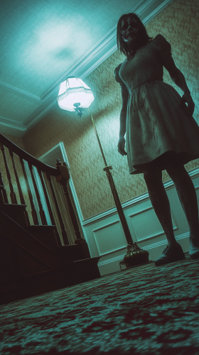 ghost in maid suites , broken and ugly body, age 30 years standy and smile,legs lost , Old hotel on background, foggy lamplit hotel at midnight. Horror. Rendered in the style of Quake,reservation old ghost, Poster Movie for promote, horror hotel by night in classic horror movie 70's style , vintage style, shot in Fuji superia X-TRA 400,some warm light from room, --ar 9:16 --v 6.1