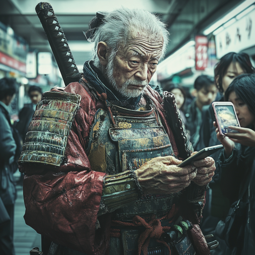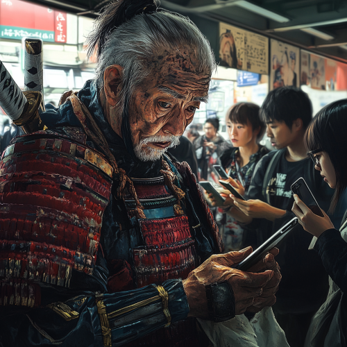 A hyper-realistic and emotionally evocative image of a 120-year-old samurai, freshly awakened from a long coma, standing in a modern Japanese public space. The samurai, dressed in ancient, weathered armor with a katana at his side, is staring in shock at a group of modern Japanese people using their smartphones. The people are casually interacting with their devices, completely absorbed, while the samurai looks on with a mix of confusion, disbelief, and awe. The background features a typical urban setting, with modern architecture and advertisements, highlighting the stark contrast between the ancient warrior and the modern world. The scene captures the overwhelming sense of alienation and amazement as the samurai tries to comprehend this unfamiliar technology.