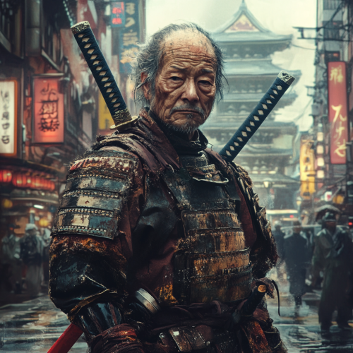 A 120-year-old samurai who has just awakened from a long coma, wandering through the modern streets of Japan. The samurai wears traditional, weathered armor with a katana at his side, appearing disoriented and out of place in the bustling cityscape. The background features a blend of old and new, with skyscrapers, neon signs, and modern vehicles juxtaposed against a traditional Japanese temple in the distance. The samurai's expression is a mix of confusion and awe as he navigates the unfamiliar environment.
