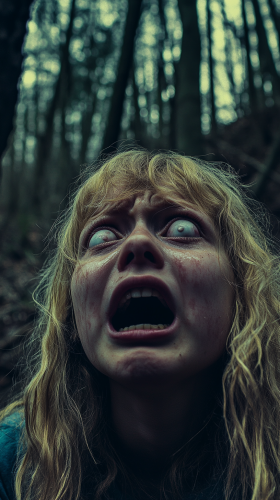 A girl is crying deep in the woods with an obviously abnormal look on her face. The girl is a 20-year-old Russian with blonde hair and a perm. The girl has unusually large eyes and mouth, and an eerie look on her face, as if she has lost her mind. This image is focused on the girl's face, as if it were a photograph taken with a single-lens reflex camera. The background is deep in a dark, deep, eerie forest. The atmosphere is gloomy and eerie. A photographic representation of reality. --no illustration, painting, --style raw --ar 9:16 --v 6.1