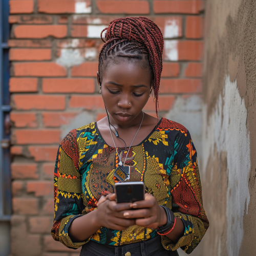 A 22-year-old African woman in an urban environment on her phone. She wears modern urban clothing, with a confused expression at not finding a user...-- style raw --v 6.0