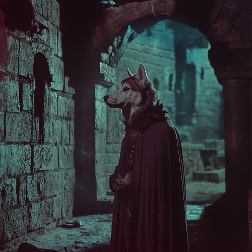 Low resolution screengrab of 1950's Super panavision 70 movie. Retro in colour. A humanoid figure with the head of a Husky dog. Wearing a cloak. The setting is a castle dungeon. Dark fantasy world. Eerie lighting --ar 1:1