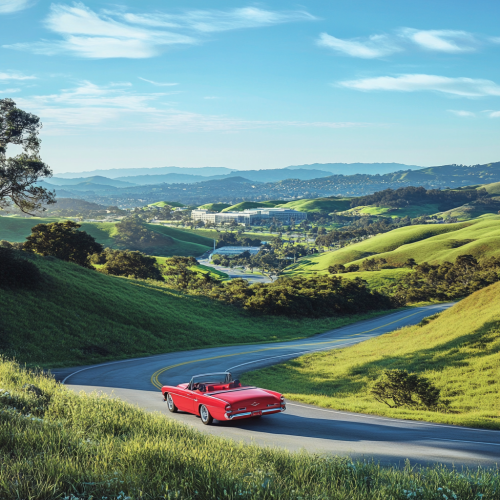A red convertible driving through Silicon Valley, with Apple Park headquarters visible on one side and a stylish corner of Rodeo Drive on the other, featuring luxury storefronts and tall palm trees. Sunny day, vibrant colors, realistic photography style, high detail, contrasting natural and urban landscapes.