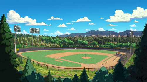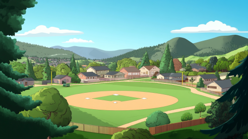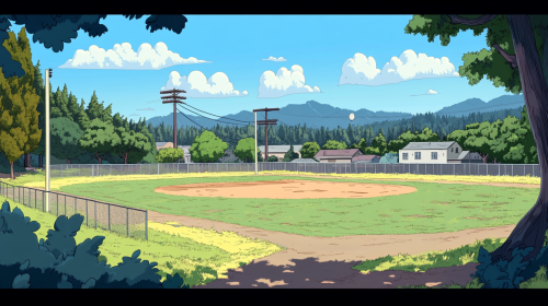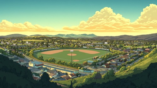 1950's baseball field in Silicon Valley as a cartoon.