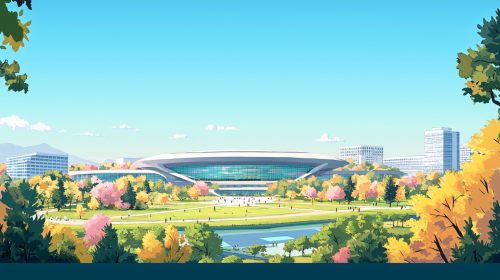 A wide-angle, distant sky view illustration of the Apple Park headquarters located in Silicon Valley, California, designed in a style suitable for a Korean webtoon. The iconic circular 'spaceship' building should appear smaller in the foreground, with more emphasis on the surrounding landscape and modern office buildings in the background. The scene should feature clean lines, vibrant colors, and a simplified yet detailed art style, perfect for use in a webtoon. The overall mood should capture the futuristic and innovative feel of Silicon Valley, with a bright and engaging atmosphere. --ar 16:9 --q 2