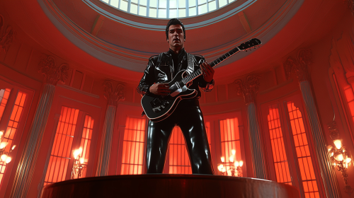 Screengrab of a 1950's super panavision 70 movie, retro style, create the original Elvis Presley standing on a music hall podium, black leather clothes, with a guitar and singing, front shot, photorealistic --ar 16:9