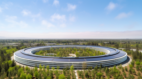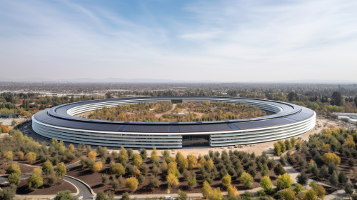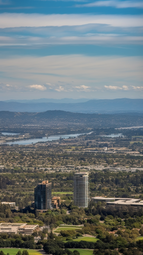 A wide-angle, distant sky view photo of the Apple Park headquarters located in Silicon Valley, California. The iconic circular 'spaceship' building should appear smaller in the foreground, with more focus on the surrounding landscape and the modern office buildings in the background. The scene should capture the vastness of Silicon Valley, with clear skies and a sense of scale, showcasing more of the cityscape and distant buildings. --v 5.0 --ar 16:9