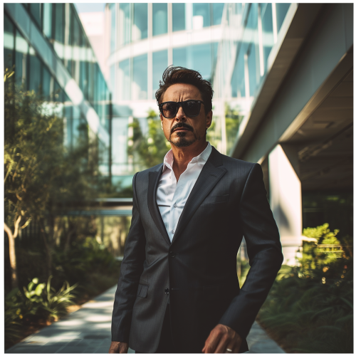 Picture a charismatic man in a sharp suit, with a goatee and stylish sunglasses, evoking the essence of Tony Stark, walking through the high-tech and innovative environment of Silicon Valley. He's examining a futuristic gadget with a look of approval. The backdrop is a blend of glass buildings and green spaces. The Polaroid captures a moment of genius at work, surrounded by the latest technological advancements. --v 6.0