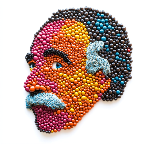 a highly abstract but identifiable silhouette albert einstein's face made of large, brightly colored balls of various sizes, facing left on a white background
