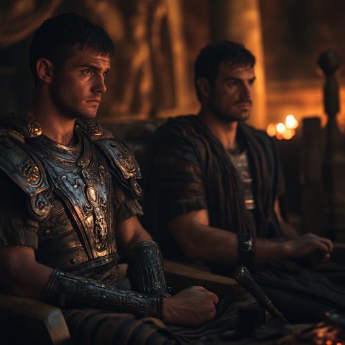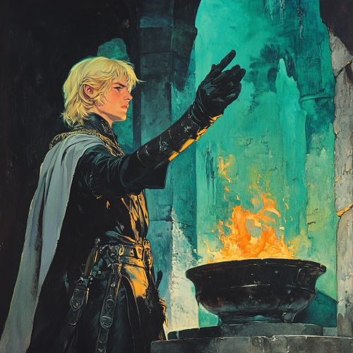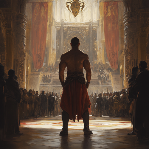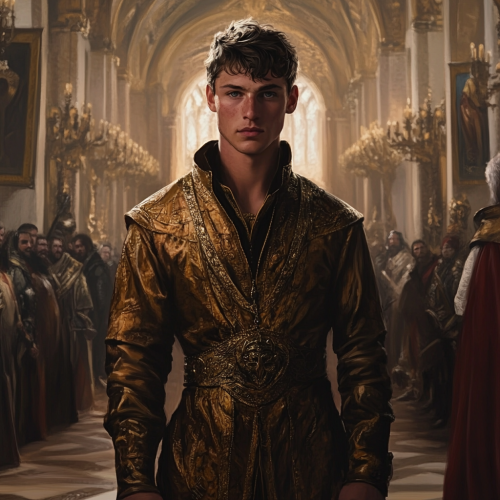 a ruggedly dressed man stands tall, proud and regal in a king's audience chamber. The man's form subtly shifts as if made from water. Highly detailed. Bright. Cinematic quality. The audience chamber is bright and filled with onlookers, curious to witness.