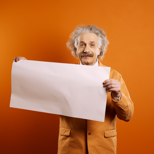 Famous person a smiling Albert Einstein, in a room with a bright orange background wall behind him, holding up a big blank sheet of paper in front of him