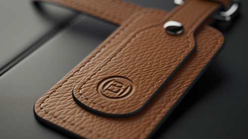luggage tag design, sustainable material, sleek design, high-quality leather, embossed logo, minimalistic style, metallic accents, modern branding, luxury travel accessory, durable, premium material, automotive-inspired, elegant finish, high detail, realistic lighting, close-up, 3D render, gift, travel essentials, photo realism, ultra realistic, --ar 16:9 --v 6.0