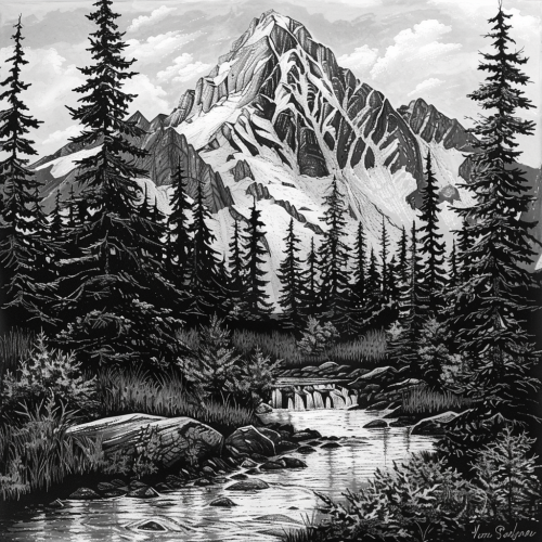 realistic black and grey picture of Alaska's Pioneer peak, with spruce trees and a little creek
