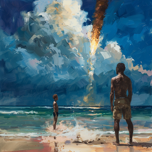 black English man and a French white boy stood in the shallow end of the sea looking out to the sea in horror watching a mermaid torpedo towards them