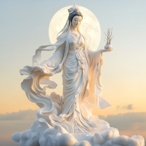 Create a serene and elegant depiction of Guanyin, inspired by the reference image. Guanyin is depicted as a graceful figure with a calm and compassionate expression. She is dressed in flowing, luminescent robes that shimmer with soft pastel hues, primarily in shades of white and light blue, with intricate gold and green detailing along the edges. Her long, dark hair is styled neatly, adorned with a small, ornate headpiece or crown. In one hand, she holds a delicate vase, symbolizing purity and grace, while in the other, she gently grasps a bamboo branch, representing resilience and peace. Ethereal, flowing ribbons of energy swirl around her, adding a mystical and divine quality to the scene. The background is minimalist, featuring soft light, subtle lanterns, or abstract elements that enhance her divine presence, creating an atmosphere of tranquility and reverence. clean background white or couldy