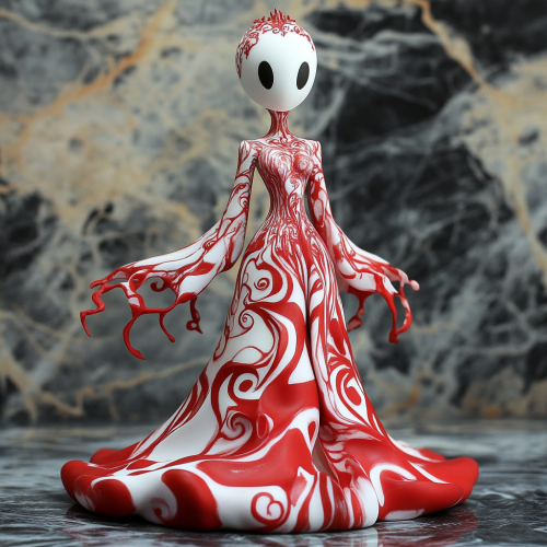 Create a 9-heads-tall soft vinyl (sofubi) figure inspired by the character and surreal world from the provided artwork. The figure should embody an elongated and graceful silhouette, with a focus on a flowing red and white gown adorned with intricate, swirling organic patterns. The design must evoke elegance with gothic undertones, and the character's pose should feel poised yet fluid, as if caught mid-motion in a gust of wind. The figure’s head sculpt should feature minimalist, mask-like facial elements, hinting at mystery, with a delicate crown-like structure on the head. Avoid expressive facial features to maintain the sense of surreal elegance. The gown should appear to extend and blend into the environment, giving the impression that the character is an integral part of a dream-like world. The base design should complement the aesthetic, integrating abstract cityscapes and swirling organic motifs into the background, reflecting a crumbling but majestic world. The transition between the figure and the base must be seamless, as if the character is emerging from or dissolving into the surreal scenery. The vinyl material should have a slightly matte finish to emphasize the sculpted details in the flowing fabric and patterns. The figure’s articulation should be subtle, preserving the artistic flow rather than emphasizing poseability, ensuring it stays aligned with the art toy tradition. Avoid any resemblance to Barbie or conventional fashion dolls, instead focusing on artistic and surreal storytelling through the design.
