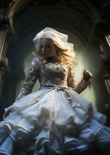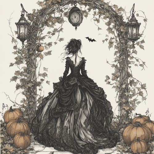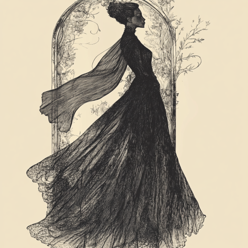 Create an Edward Gorey-inspired illustration featuring a graceful figure in an elegant, flowing gown. Use intricate cross-hatching to emphasize the texture and movement of the dress, capturing the delicate ripples and shadows in the fabric. Render the figure with a stylized, detached expression and slightly exaggerated proportions, reflecting the eerie calm typical of Gorey’s characters. The background should be minimal, incorporating symbolic elements such as abstract floral motifs or arches, subtly drawn to add depth without overwhelming the composition. Use negative space effectively to evoke both elegance and a sense of quiet tension. Let the flowing gown and floral decorations hint at a deeper narrative--perhaps one of beauty masking solitude. Maintain fine lines and a subdued palette to mirror the melancholic and surreal nature of Gorey’s aesthetic.
