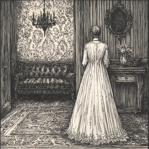 Create an eerie, refined illustration in the style of Edward Gorey, depicting a solitary figure in an elegant white gown standing within a dimly lit, richly decorated room. Use intricate cross-hatching to capture the texture of the flowing gown and the ornate furniture. Ensure the figure appears emotionless, with a slightly rigid, unnatural pose to evoke Gorey’s signature detachment. The setting should feature high-contrast lighting, with dark shadows and subdued highlights emphasizing a sense of quiet tension. Simplify the background to include only essential elements--a few potted plants, a chandelier, and a decorative sofa--creating a minimalist but atmospheric environment. Introduce subtle symbolic motifs, such as a vase with wilting flowers or a flickering candle, hinting at melancholy or hidden emotions. Employ fine lines and negative space to convey a sense of isolation, elegance, and subtle unease.
